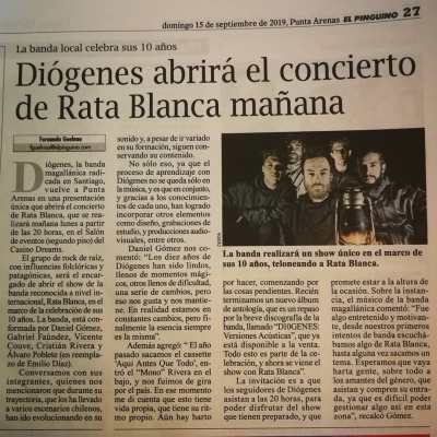 Cuando se disolvió ZOOM ABSTRACTION, quedamos Gabriel y yo (René) con la idea de seguir componiendo nueva música y grabar temas que permanecían inéditos, ya con otras influencias mas diversas que nos llevaron a encontrarnos con nuestras raíces musicales. DIOGENES se fundó el día 1 de enero de 2009 en la ciudada de Punta Arenas, patagonia chilena… Ya veníamos intentando hacer bandas desde el año 2000 aprox., primero QUITRALPIYAN, luego MISTICA CONTEMPORANEA, ZOOM ABSTRACTION y DIOGENES, recién pudo reunir todos los elementos musicales de la banda.
